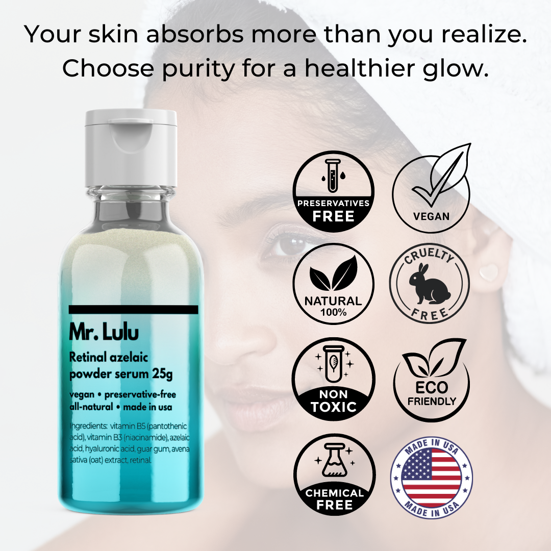 Mr. Lulu formulations contain active ingredients only—no water, thickeners, stabilizers, preservatives, or synthetic fillers—for higher potency and better skin results.