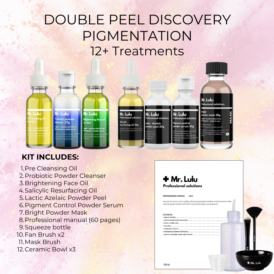 Start your journey with Mr. Lulu Skincare and the Double Peel through our Discovery Kit—the most accessible way to experience the system. This kit includes all the essential tools and formulas needed to learn the treatment, understand its versatility, and begin integrating it into your practice.